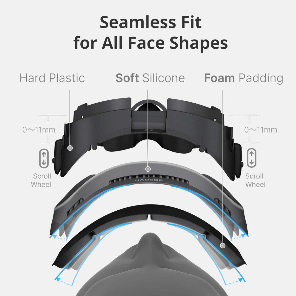 Mīkstas putas un silikons labākai pielāgošanai – stingru plastmasas interfeisu vietā tiek izmantotas mīkstas silikona un putas, lai samazinātu spiedienu uz vaigu kauliem un pieri, pielāgojoties sejas formai.